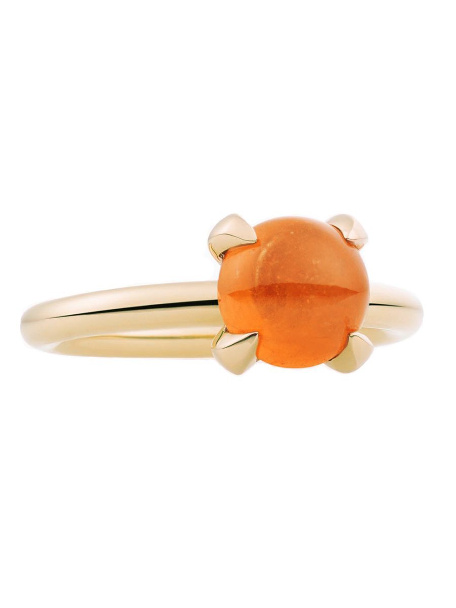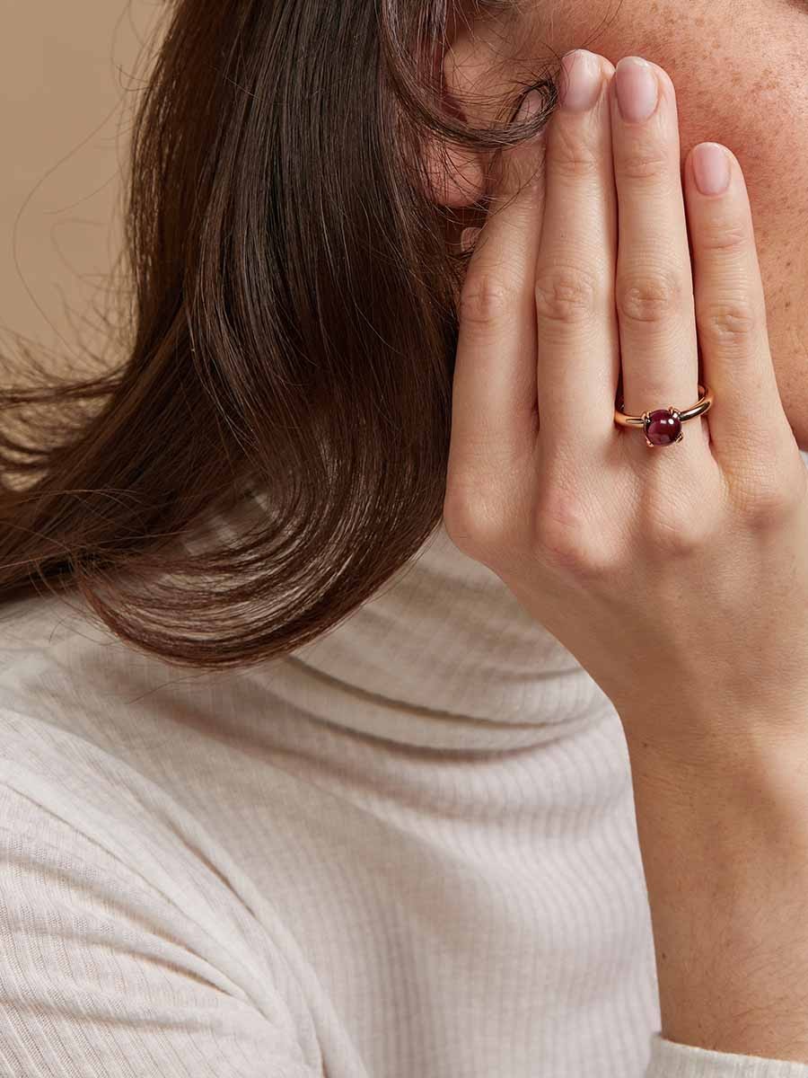 De edelstenen zijn verkrijgbaar op bijna alle mogelijk kleuren en zijn echte eye'catch'ers. Deze ring is uitgevoerd in 18 karaat roségoud en is gezet met een dieprode rhodoliet. De edelsteen is cabuchon geslepen en heeft een subtiele uitstraling maar de ring is daarom erg goed te combineren.