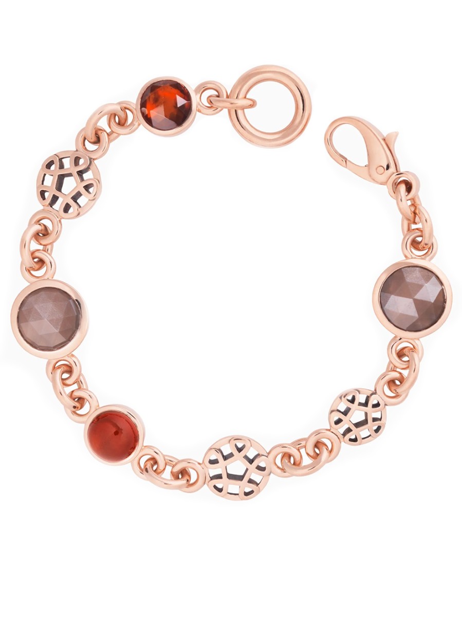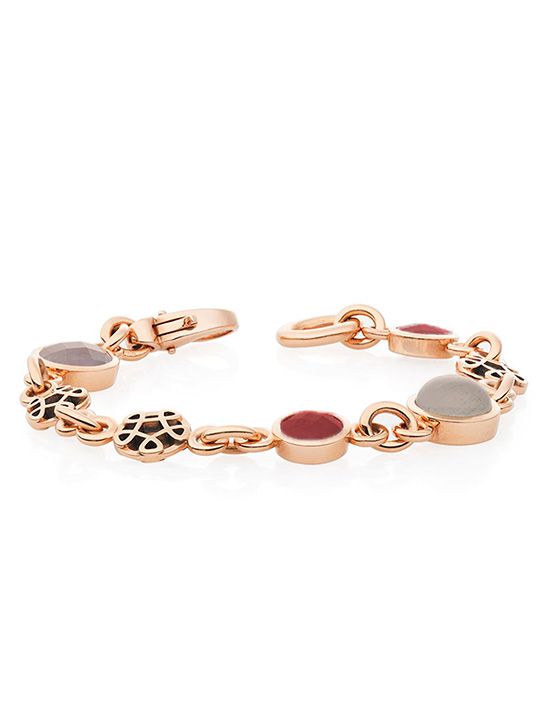 Deze armband is onderdeel van de 'Toujours Ajour'-collectie. Deze serie bevat grootse en een tikje extravagante ontwerpen, zo ook deze prachtige armband. De armband is gemaakt van 18 karaat roségoud en valt soepel om de pols. Op een speelse wijze is de armband versierd met de edelstenen: Hessonniet en Maansteen. De donkerrode en diepgrijze kleuren van de edelstenen geven de armband een warme, elegante uitstraling. De edelstenen zijn gezet in roségouden zetkasten. De massieve gouden schakels verbinden de edelstenen en bekende Ajour emblemen met elkaar. Kortom; een schitterend juweel!