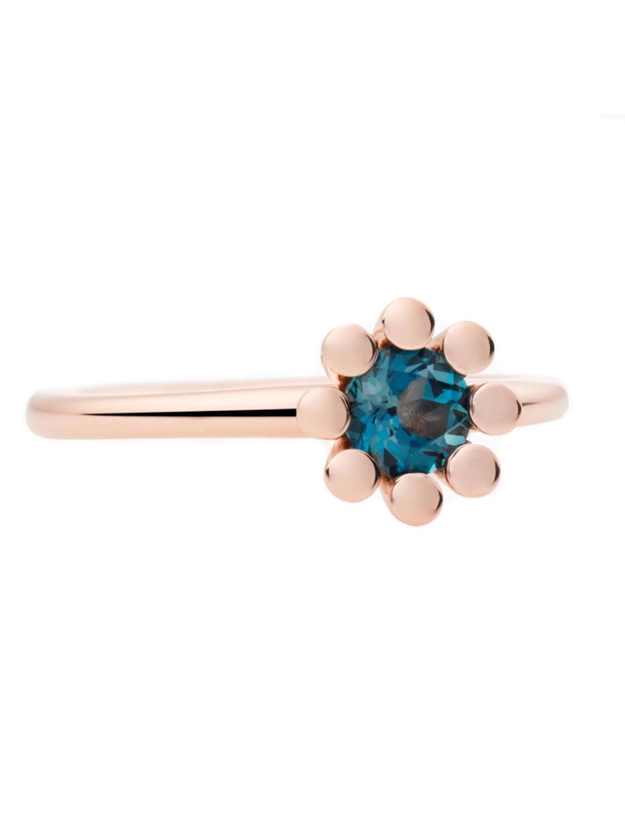 Dit model is onderdeel van de vrolijke en zeer kleurrijke 'Sprite'-collectie. De ring is uitgevoerd in 18 karaat roségoud en is gezet met een gefacetteerd geslepen london blue topaas (6 mm). Om deze edelsteen heen zijn kleine blauwe diamanten geplaatst (0,14crt.). De edelstenen zorgen voor een schitterende combinatie van kleur en stralen in het licht. Deze prachtige ring is los te dragen, maar kan ook perfect met andere BRON ringen gecombineerd worden.