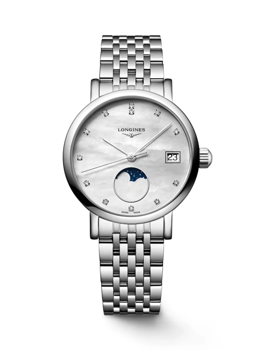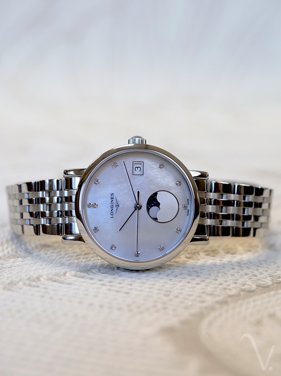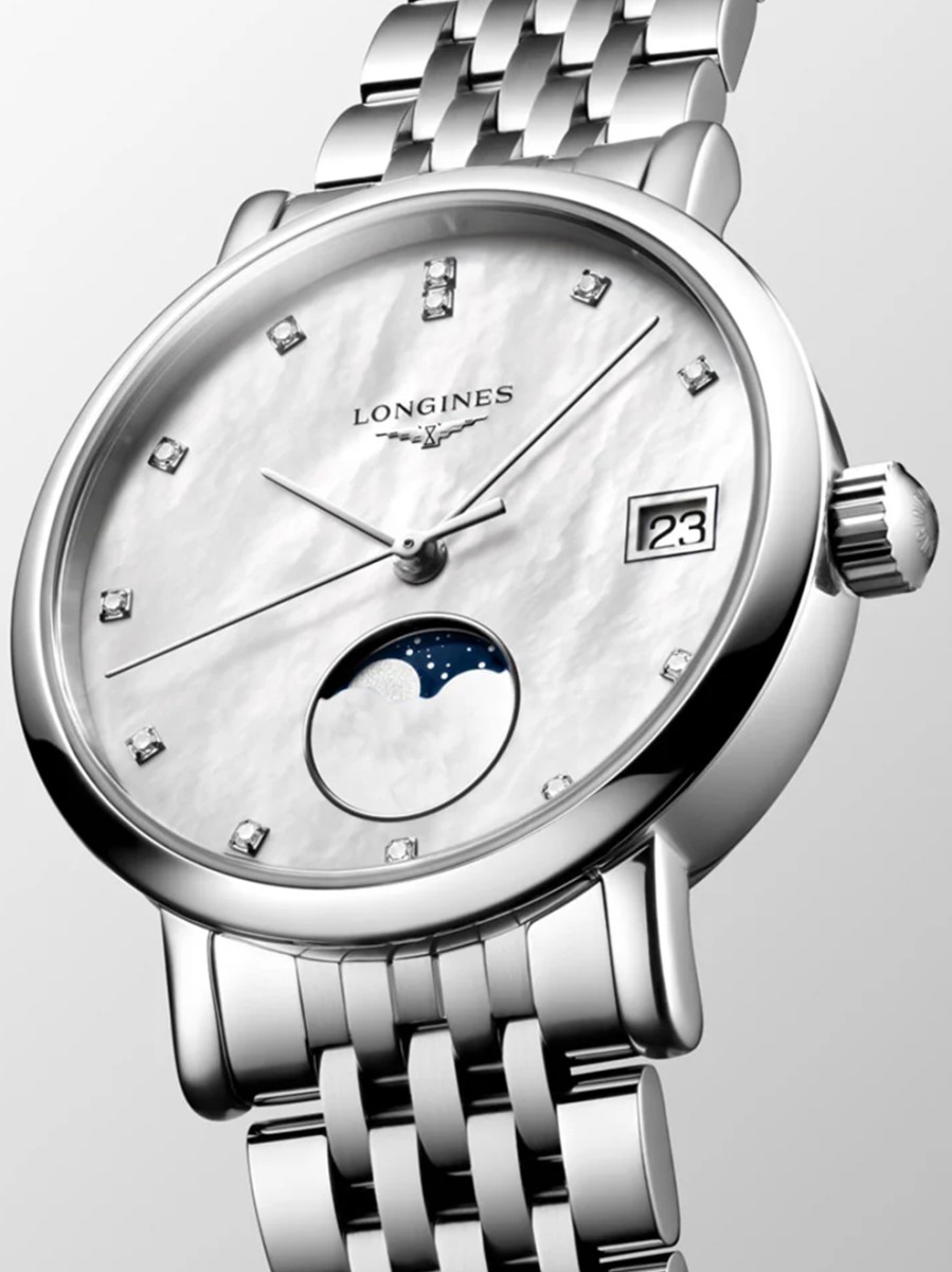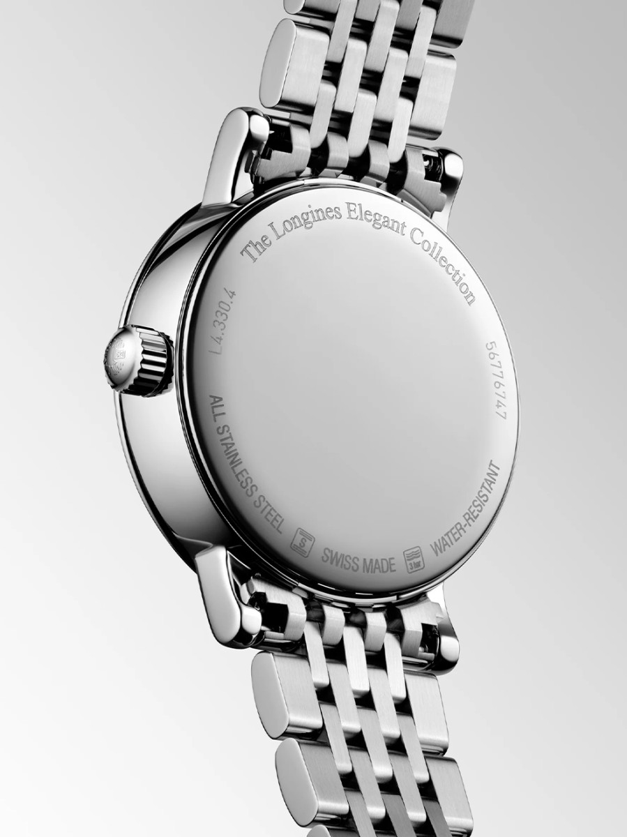Dit dameshorloge L4.330.4.87.6 hoort bij de Longines Elegant Collection serie. Deze lijn bevat elegante horloges, vaak voorzien van diamant of een maanstand. Dit model is uitgevoerd met een prachtige parelmoer wijzerplaat, een maanstand en een datumaanduiding. In de wijzerplaat zijn twaalf briljant geslepen diamanten gezet, met een totaalgewicht van 0,040crt. Het horloge heeft een edelstalen kast met een diameter van 30 millimeter en een stalen horlogeband. Zowel aan de voor- als achterzijde is het mechanische uurwerk via het saffierglas te bewonderen. De L43304876 is voorzien van een quartz uurwerk en is tot 30 meter waterdicht. Dit Longines horloge is een prachtexemplaar voor dames die van stijlvolle horloges van hoge kwaliteit houden!