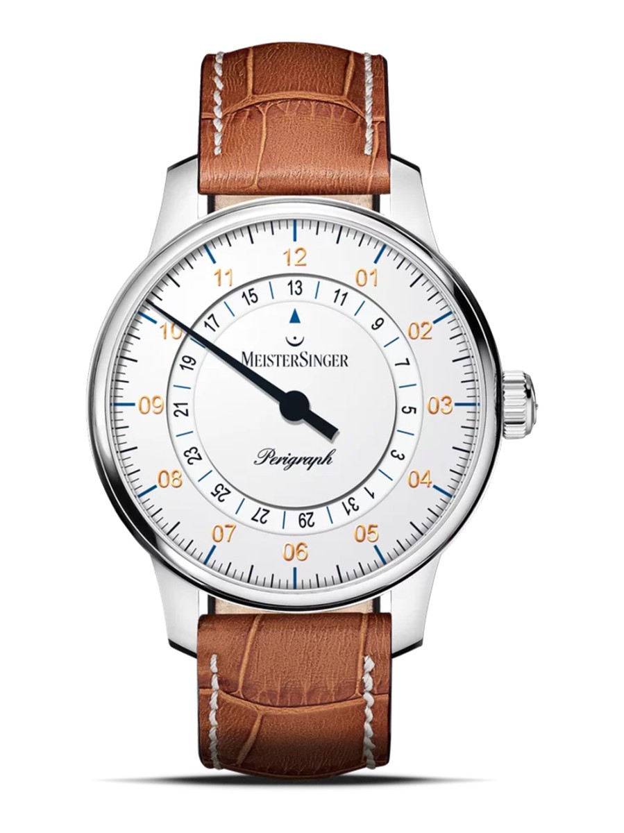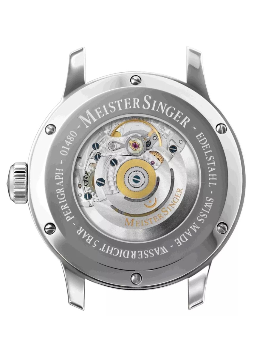 Dit mechanische horloge behoort tot de Meistersinger Perigraph serie. Met deze klassieke lijn gaat het duitse merk terug naar de jaren zestig waar ronde vormen, een strak uiterlijk en een heldere uitstraling de trend was. Het bijzondere aan de modellen is de speciale datumring die op de wijzerplaat te vinden is. Alle horloges hebben één wijzer, waarbij elke index staat voor precies 5 minuten. De wijzer is dus zowel een uurwijzer als een minutenwijzer.