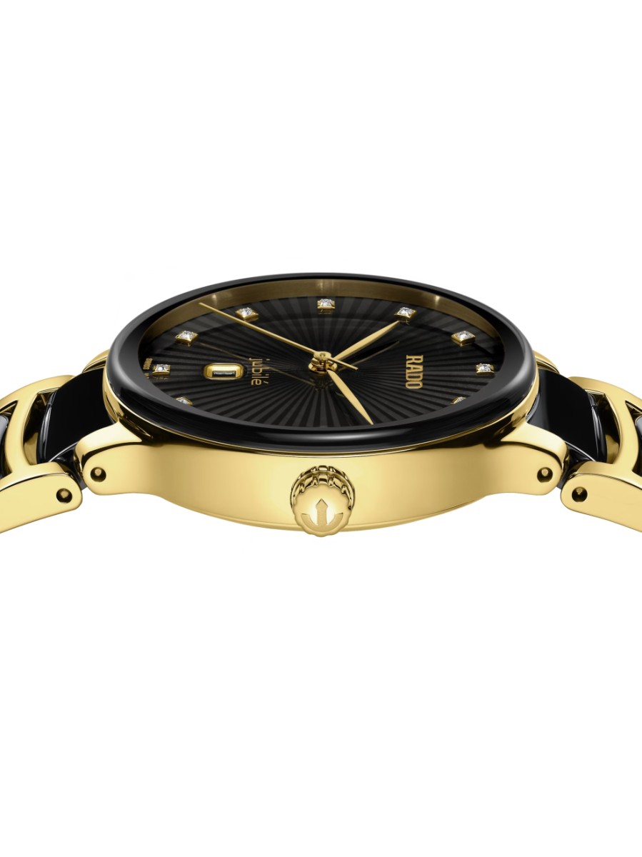 Het model is voorzien van een zwarte wijzerplaat waarop naast de tijd ook een datumaanduiding te zien is. In de wijzerplaat zijn twaalf diamanten gezet die schitteren in het licht. De R30025742 loopt op een quartz uurwerk. De horlogeband is gemaakt van high tech keramiek in zwart kleur gecombineerd met goudkleurig edelstaal. Het horloge is tot 50 meter waterdicht en heeft een krasarm saffierglas. Kortom, een uniek horloge voor vrouwen die van klassieke horloges houden.