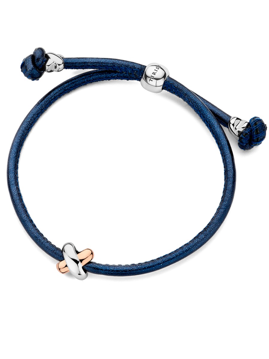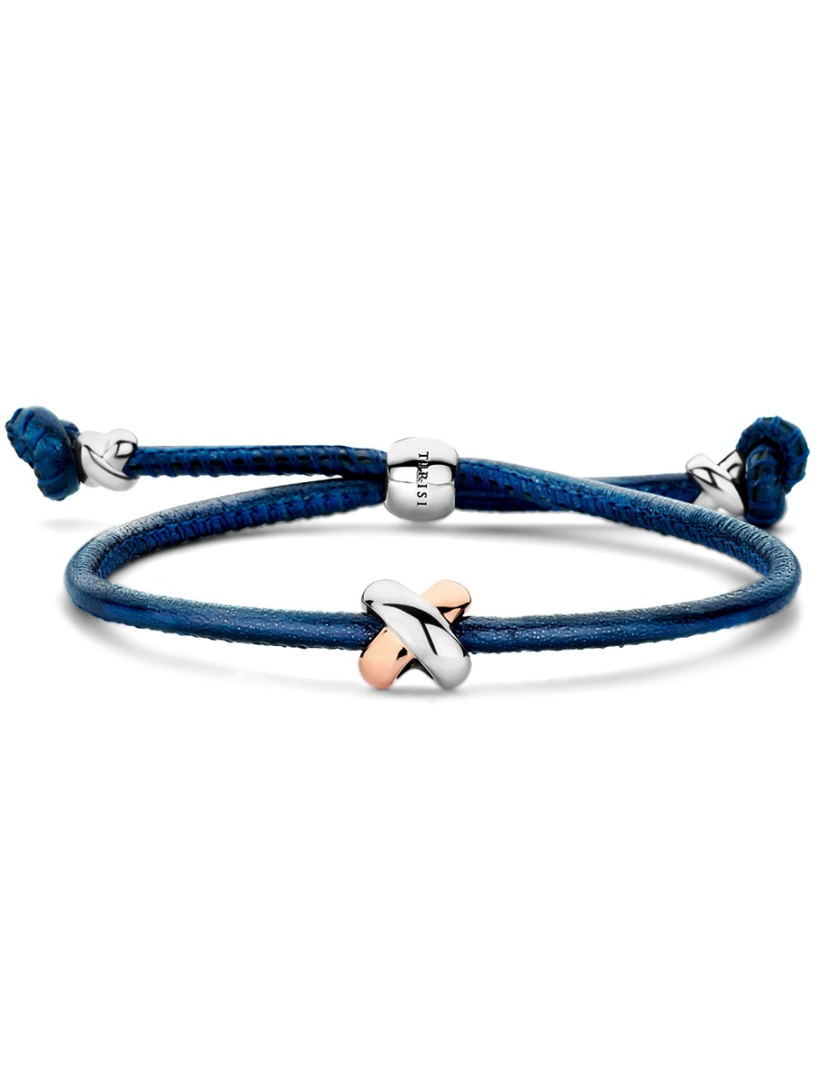 Deze fijne armband is een hit binnen de collectie van Tirisi Moda. De blauwe armband is gemaakt van hoge kwalitieit kalfsleder. Aan de voorzijde is het armbandje versierd met een stoer x-je (kusje), gemaakt van Sterling Silver en 18 karaat roségoud.