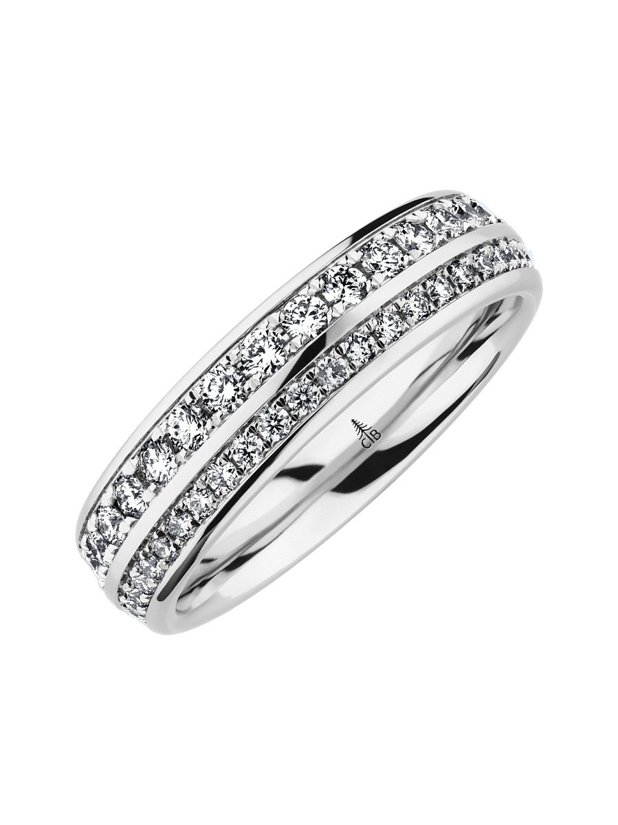 Deze 5 mm brede witgouden trouwring is bezet met maar liefst 77 diamanten (in totaal 1,00 ct). De stenen zijn verfijnd in twee banen gezet, wat zorgt voor een krachtig lijnenspel en een schitterend effect bij iedere beweging.