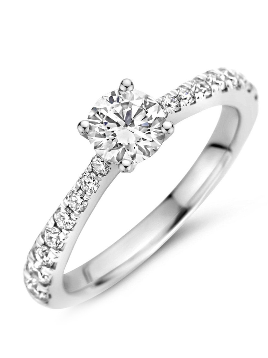 Deze luxe dames ring heeft een zeer draagbaar en tijdloos ontwerp. Het model is gemaakt van platina. Dit materiaal staat bekend als het duurzaamste, zuiverste en zeldzaamste edelmetaal ter wereld. De solide scheen loopt een taps toe naar het stralende middelpunt; een briljant met een grootte van 0,60crt. Deze eyecatcher is gezet in een stevige vierpoot-zetting. Ook in de scheen zijn schitterende briljant geslepen diamanten gezet, met een totaalgewicht van 0,40crt. Een tijdloos en stijlvol plaatje aan iedere dameshand!